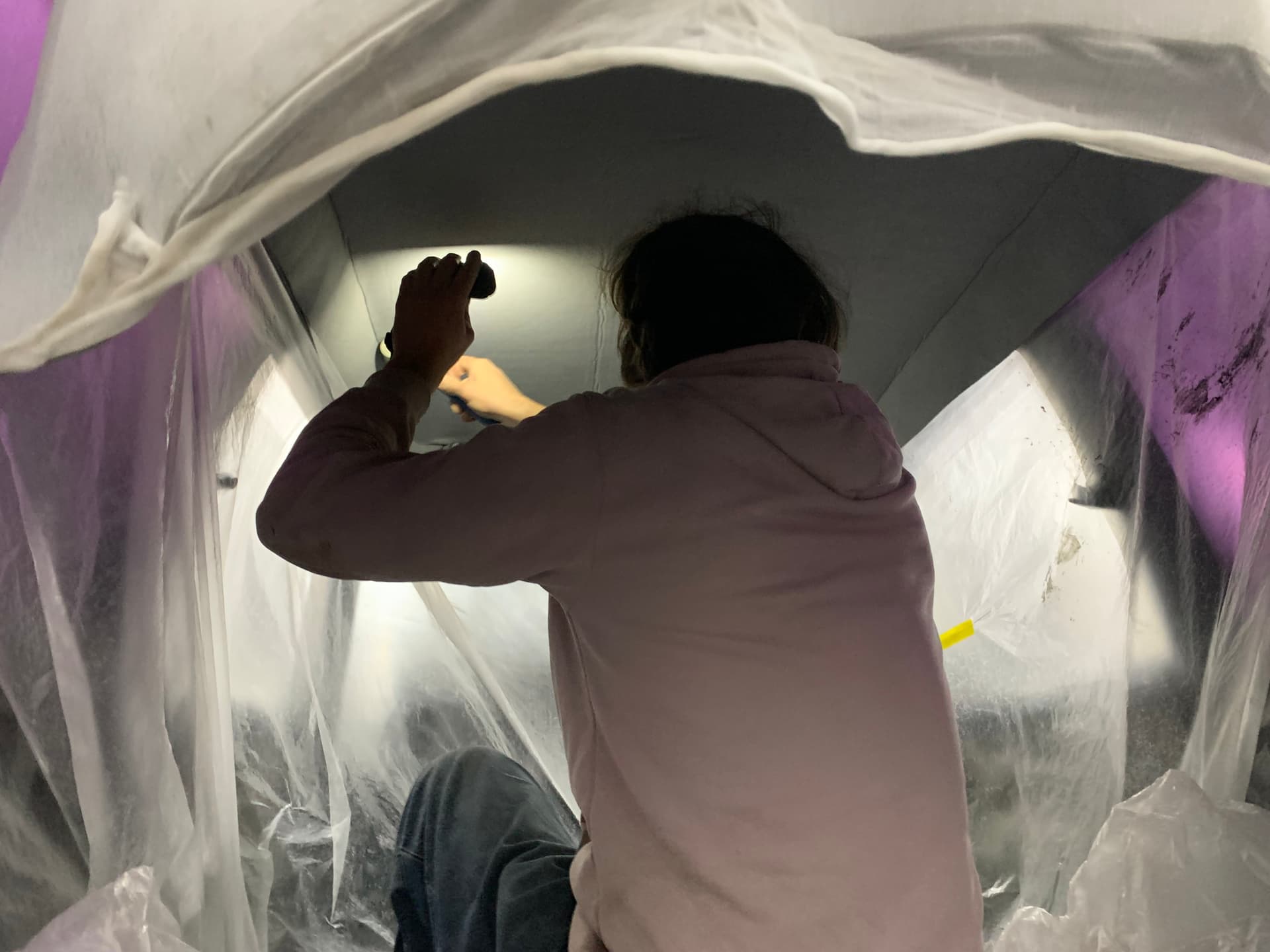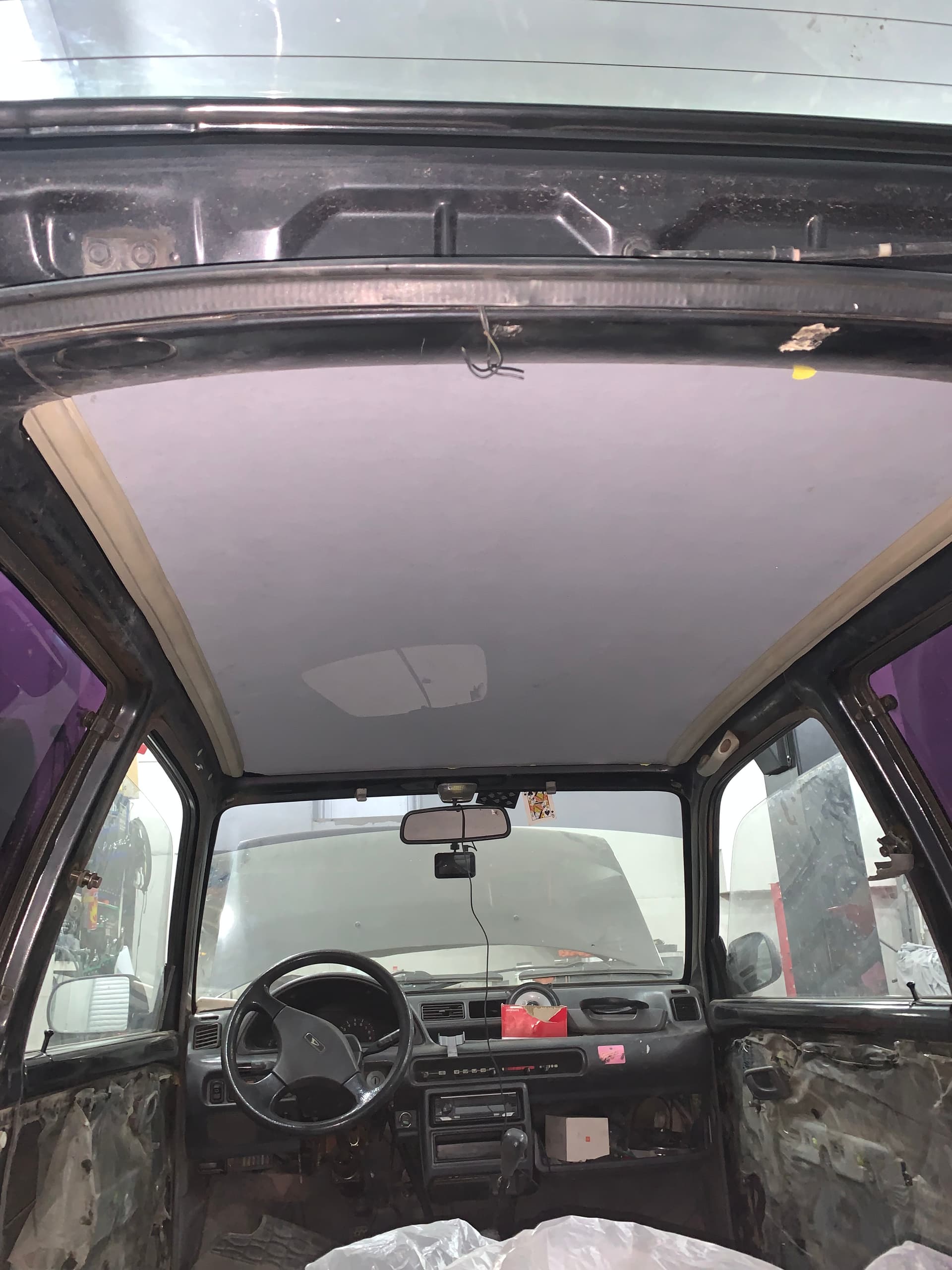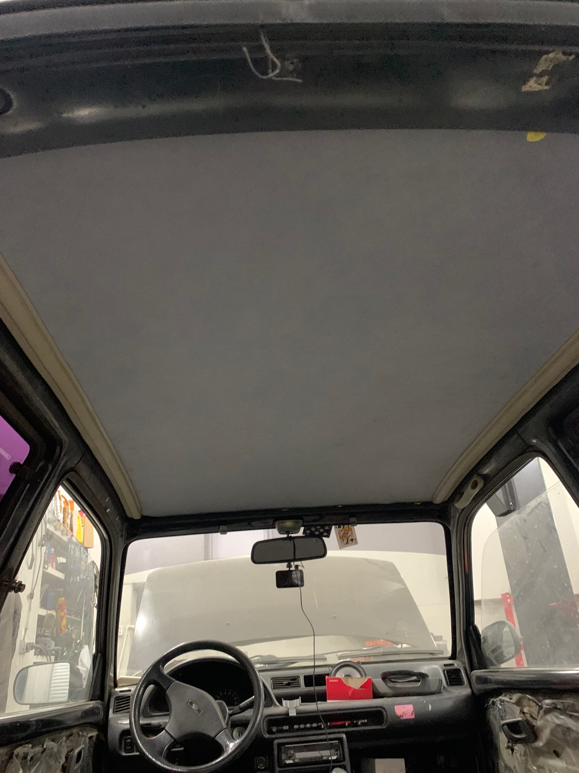 that was hard.. if you plan to do it, do not throw away old ceiling, first make a cutout with old shape and cut new cover on the table. make sure to cover interior with plastic film to avoid glue from spraying everywhere. then get inside your car, tuck in front side of new cover in car body roof gaps, we used pieces of rubber hose. when one side of ceiling is attached, start applying glue on both car roof and new cover. align everything and make one center line pass, after use roller on sides from center