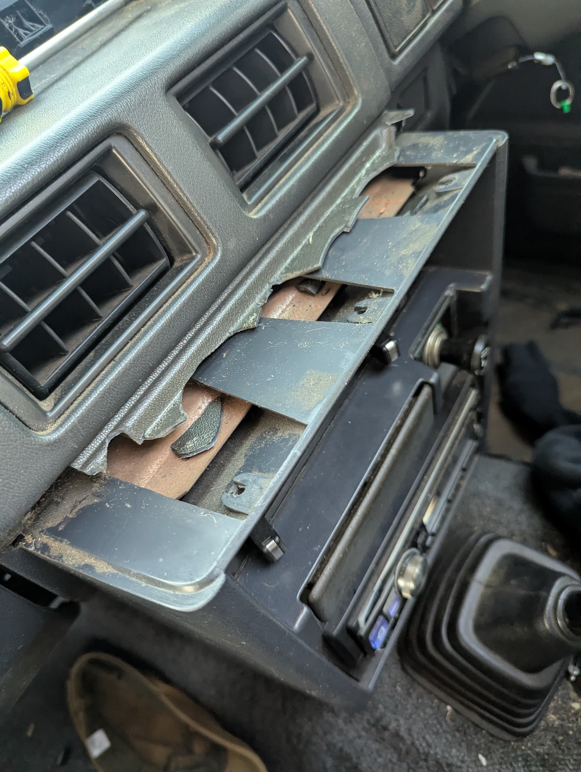 If your tray is broken as much as mine was, you can undo the three back screws without taking the dash out, using a pair of pliers and a lot of patience. The model uses pins not screws making it so much easier to install.