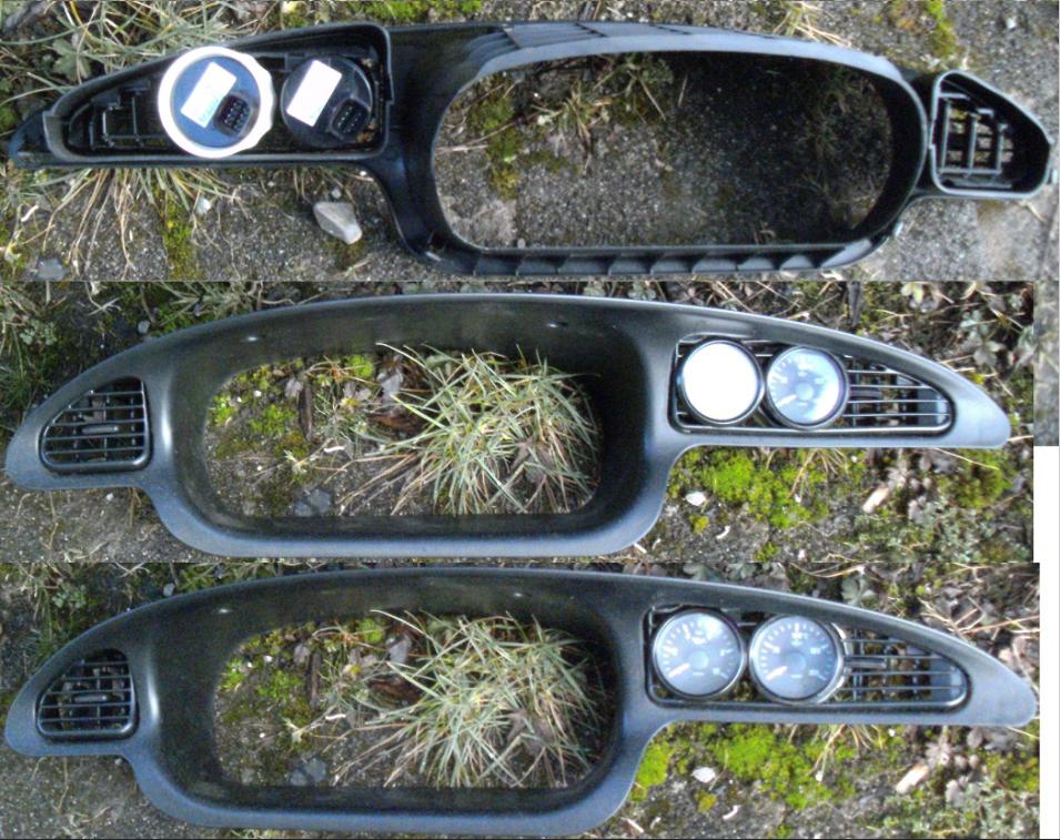 This is going to be even more fun than doing the wiring. Planned are cutting out the vents circled white. Cutting out both light yellow circled left and the circle closest to the cluster is to be evaluated, as an alternative to placing both of the guages together.